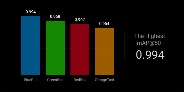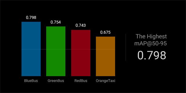 - Blue Bus : mAP@50 = 0.994, mAP@50-95 = 0.798 | Training : 4,000 synthetic labeled samples (1280x1280) | Validation : 1,000 real labeled samples | Object size : 440px