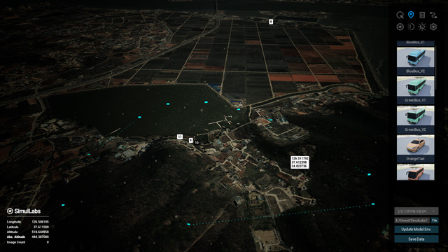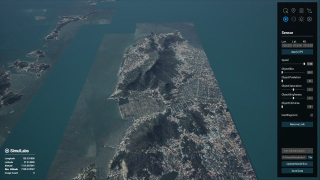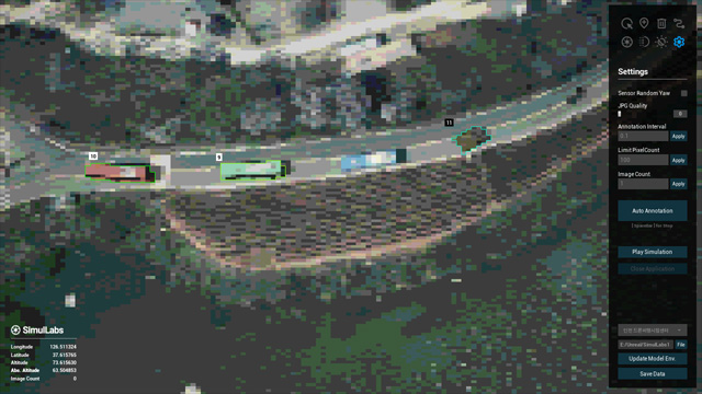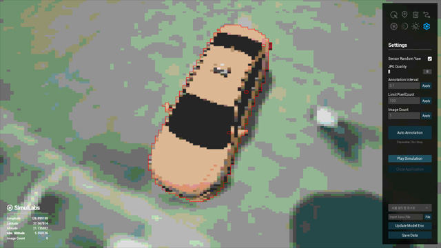 - Automatically generates 2D projections with BBOX, Segmentation, PixelCount and LLA labels, exported as JPG and JSON at 10 FPS.