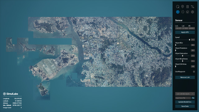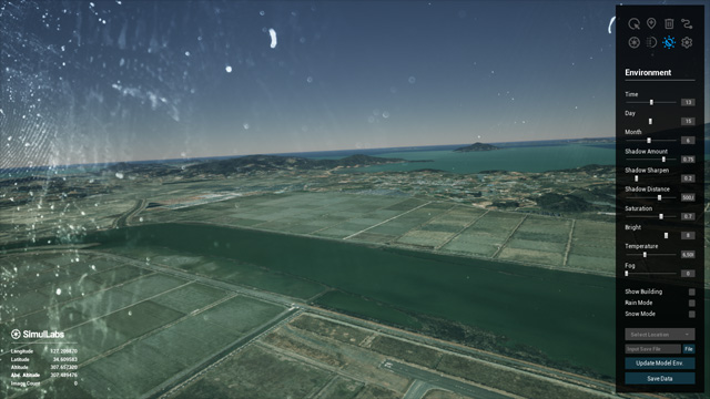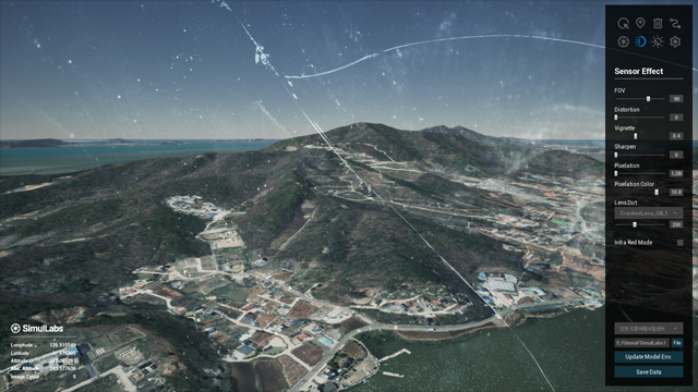 - Applies various sensor and environmental effects including pixelation, saturation, distortion, shadows, brightness, temperature, rain, snow, lens dirt, FOV, and vignette.